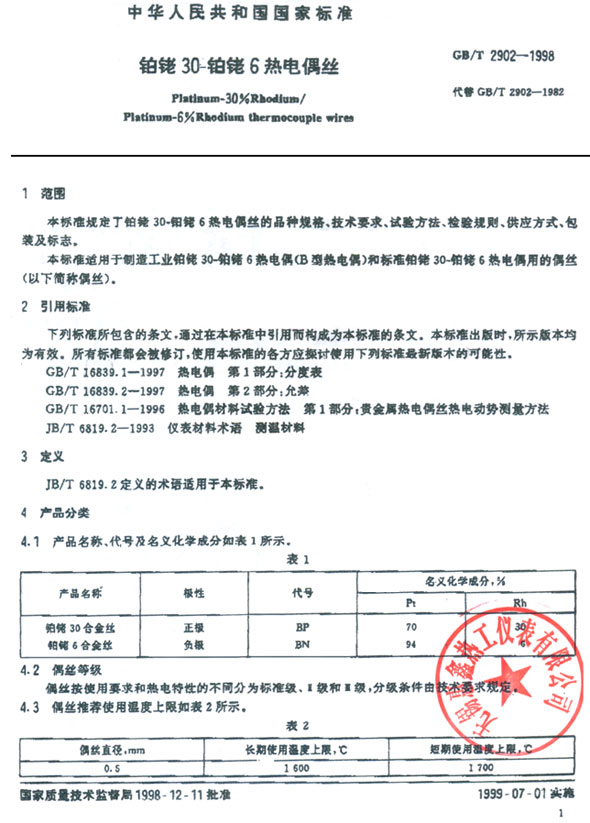 B分度號 鉑銠30-鉑銠6熱電偶標(biāo)準(zhǔn)